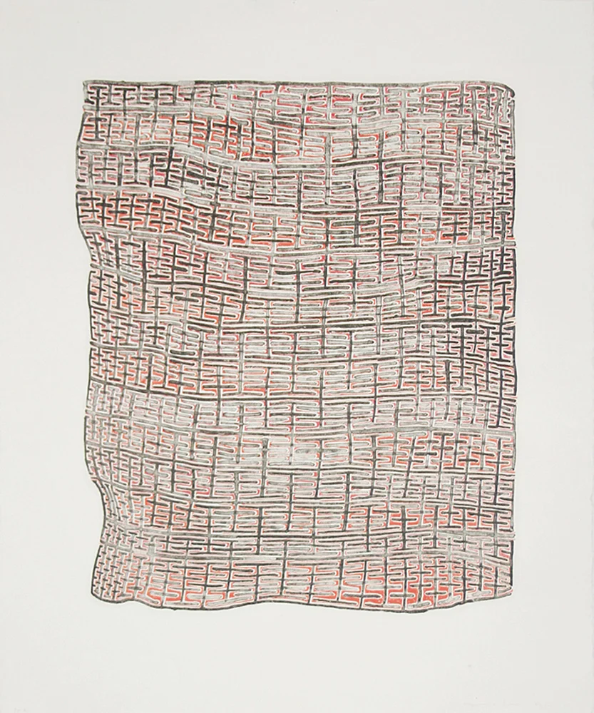 James Siena, "Twisted and Glitched Recursive Combs, Red and Black", 5 color lithograph. 20" x 24". Published by Tamarind Institute 2011. Alex Kirillov, collaborating printer.