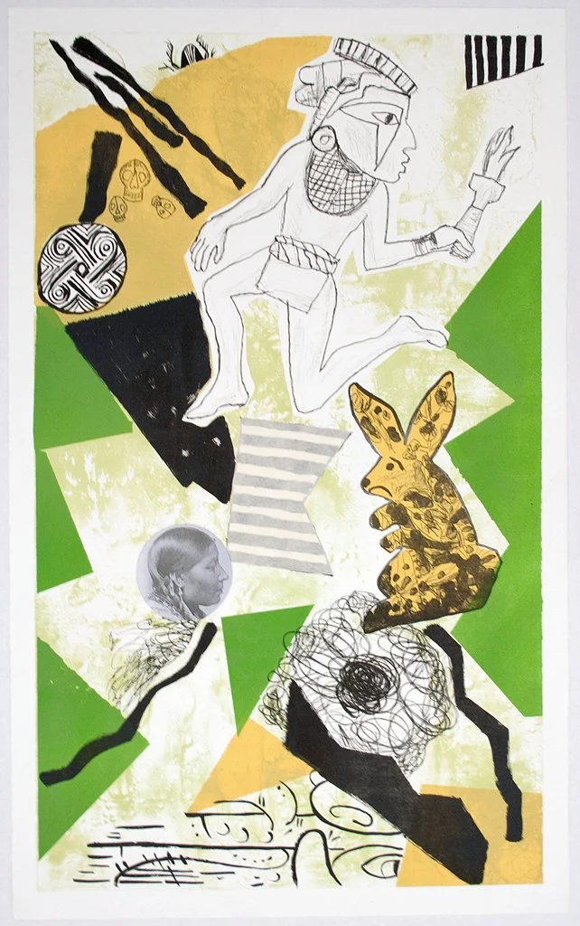 Jaune Quick-To-See Smith, "Earth People", 4 color lithograph. 22" x 36". Published by Tamarind Institute 2011. Peter Haarz, collaborating master printer. Alex Kirillov, edition printer.
