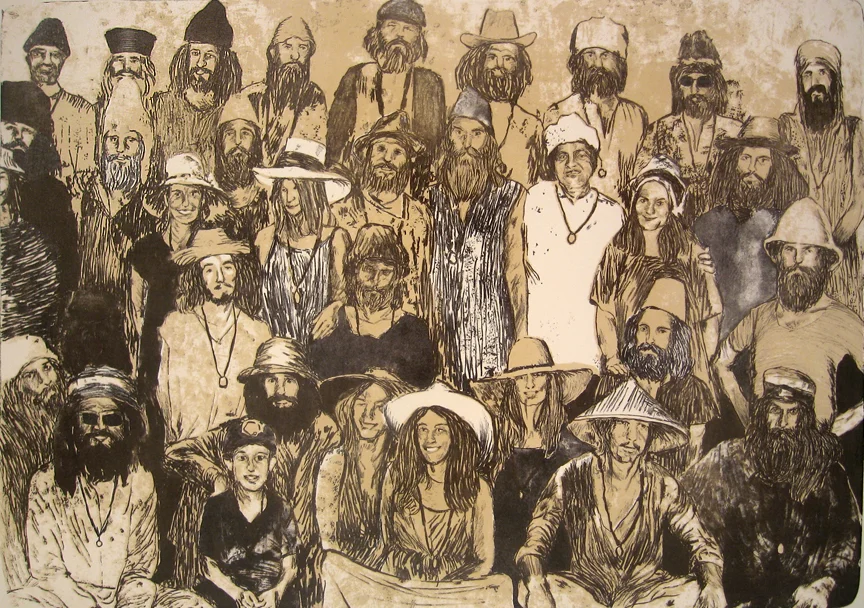 Mike Pare, "Hats" version 2, 3 color lithograph, 44" x 30". Published by University of New Mexico and Tamarind Institute 2011. Alex Kirillov, collaborating master printer