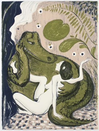 "Crocodile (after L'Alpha et L'Omega)". 3 color lithograph, 22" x 30". Published by the artist at Stonefox Editions 2015. Collaborating master printer Alex Kirillov
